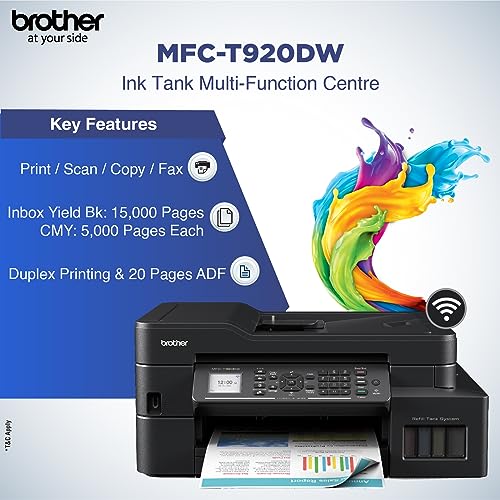 Brother MFC-T920DW Auto Duplex Printer – Print, Scan, Copy, Fax, ADF, WiFi/LAN/USB, Print Up to 15K Pages in Black and 5K in Color Each for (CMY), Get an Extra Black Ink Bottle, Free Installation