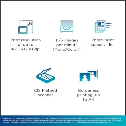 About this item Printer type: Inkjet ; Functions: Print, Scan, Copy ; Printer output: Colour ; Connectivity: Wi-Fi, AirPrint, Mopria, Direct Wireless, USB 2.0 ; Scanner: Yes ; Scanner resolution:600 x 1200dpi OS Compatibility: Windows 11 / 10 / 8.1 / 7 SP1 (operation can only be guaranteed on a PC with a pre-installed Windows 7 or later), macOS 10.14.6 – 12 or later, Chrome OS; Mobile connectivity : Yes (via Canon Print Service, PIXMA Cloud Link, Canon PRINT Inkjet/SELPHY, Airprint); Hardware Interface: USB 2.0 ; Enlarge/reduce option: No ; Duplex: No Print Yield: Mono- 3100 prints, Color- 4400 prints (as per ISO/IEC 24711 (for A4 size) using ISO/IEC 24712 test file.), Maximum Print Speed: 11/6 (mono/color) images per minute; Print cost Monochrome: Rs 0.13 ; Print cost color: Rs 0.25 ; Maximum Print Resolution: 4800 x 1200 dpi Page size: A4, A5, A6, B5, LTR, LGL, Executive, Oficio2, B-Oficio, M-Oficio, Legal (India), Foolscap, F4, 4 x 6″, 5 x 7″, 7 x 10″, 8 x 10″, Envelopes , Square, Card Size ,Custom Size- Width: 55 – 216 mm, Length: 89 – 1,200 mm; Max paper thickness: 64 to 275 GSM ; Maximum Input Sheet Capacity: 100 sheets (A4); Compatible ink:GI 71 Cyan, Magenta, Yellow, Black; Additional Printer Function:, Print modes- Standard and Economy ; Power wattage of printer: OFF: 0.1W, Standby (scanning lamp is off):0.6W, Copying (USB connection to PC): 16W Special Features: Borderless Print, Camera Direct via Wireless LAN; Ideal Usage: Home, Home Office; Included Components: Printer, Power Cord, USB cable, Instruction Manual, 1 set of GI71S Cyan, Magenta, Yellow and Black ink bottles Warranty: 2 Years or 30,000 prints whichever is earlier (Including print heads) onsite warranty from the date of purchase. Warranty applicable on manufacturing defects only.