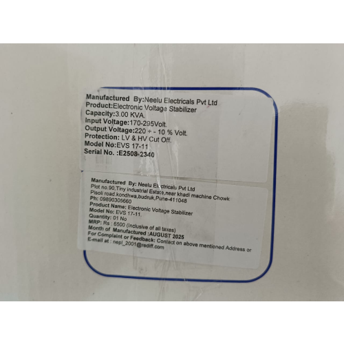 Protect your appliances with the Neelu Electricals 3.0 KVA Electronic Voltage Stabilizer (EVS 17-11). Designed with wide input voltage range (170V–295V) and output of 220V ±10%, it ensures safe and stable power. Features LV & HV cut-off protection for maximum reliability.
