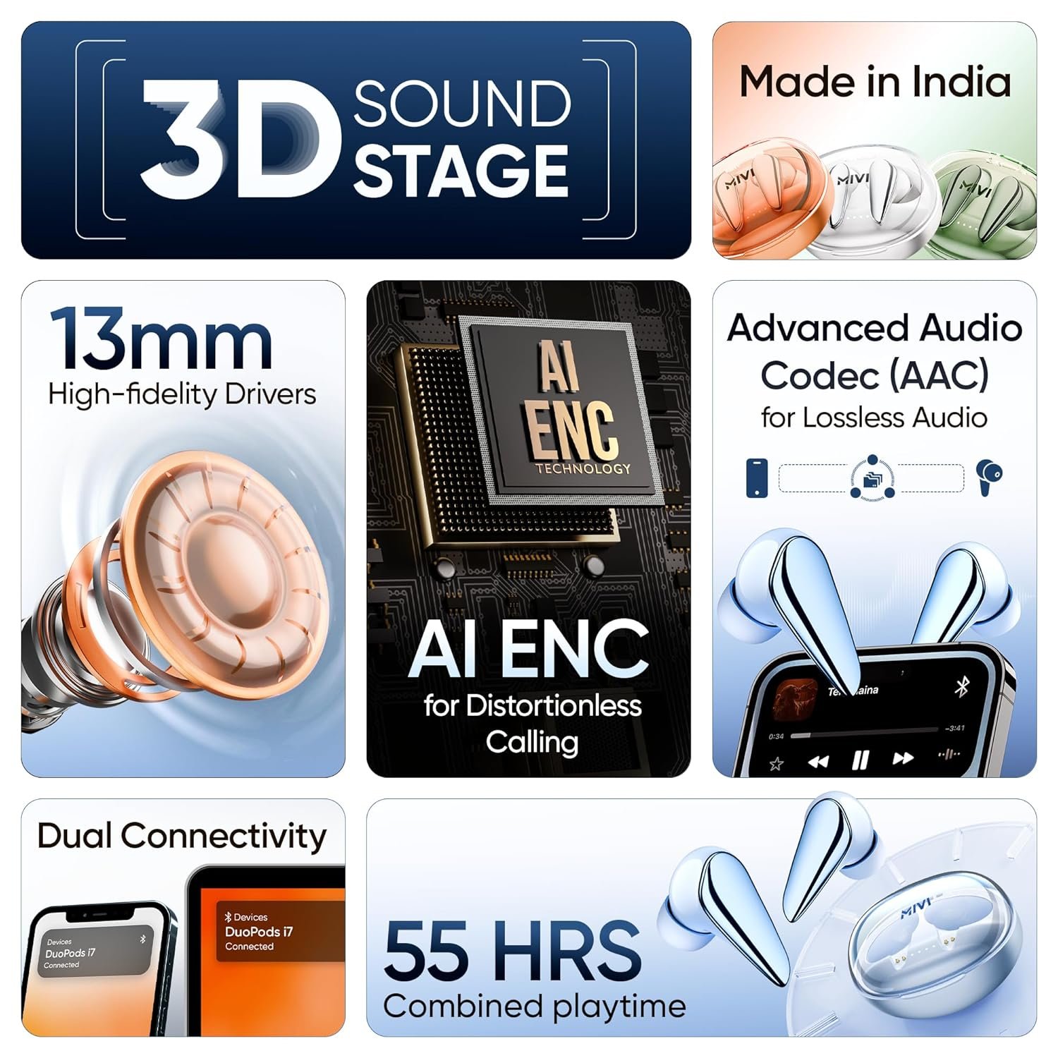 Mivi DuoPods i7 in Ear Ear Buds Wireless -The 3rd Dimension of Sound with 3D Soundstage, High Fidelity Drivers, Advanced Audio Codec for Lossless Audio Earbuds, Made in India