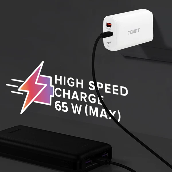 Tempt Alpha 65W Dual Port GaN Fast Charger (USB-C PD + QC 3.0) | Smart, Safe & Compact